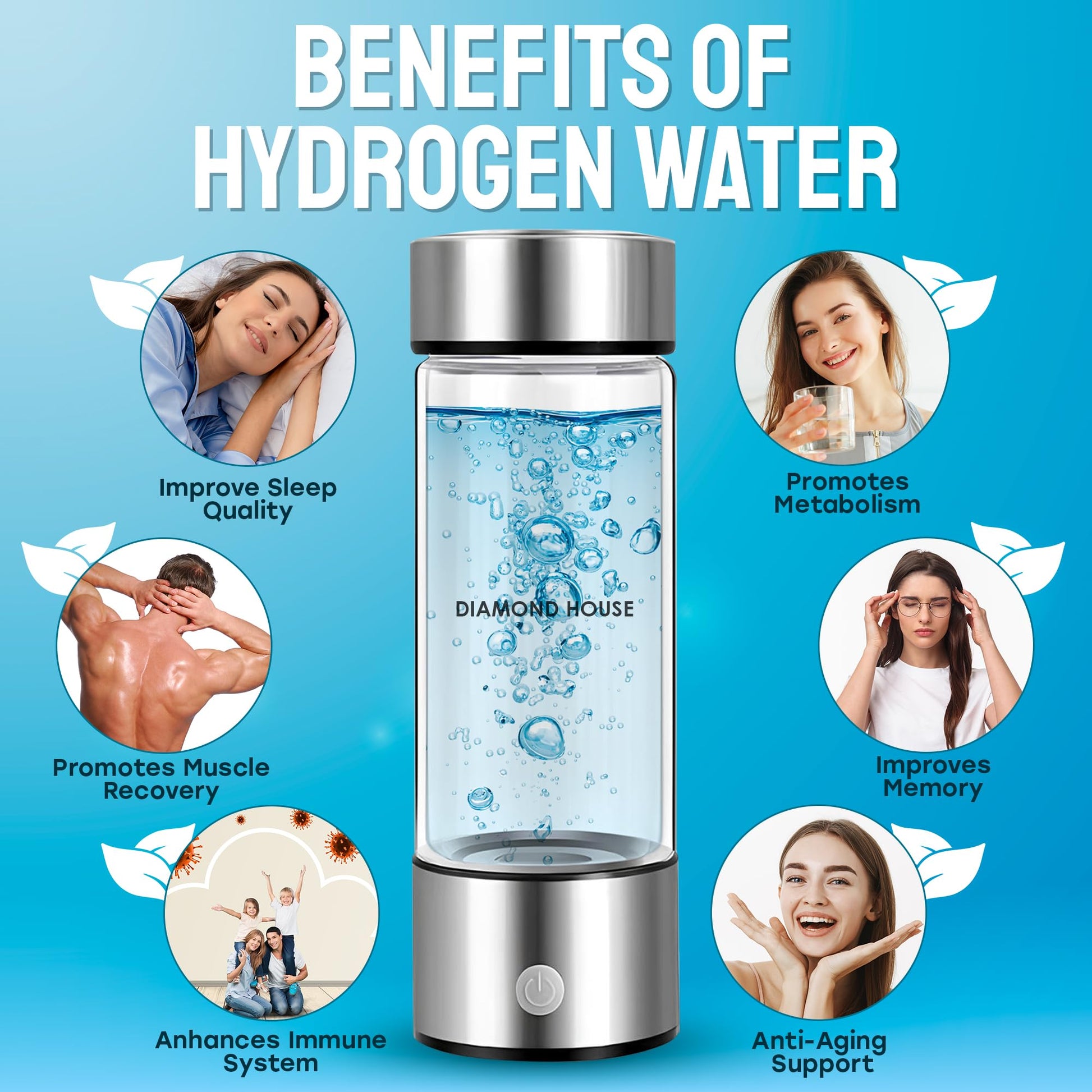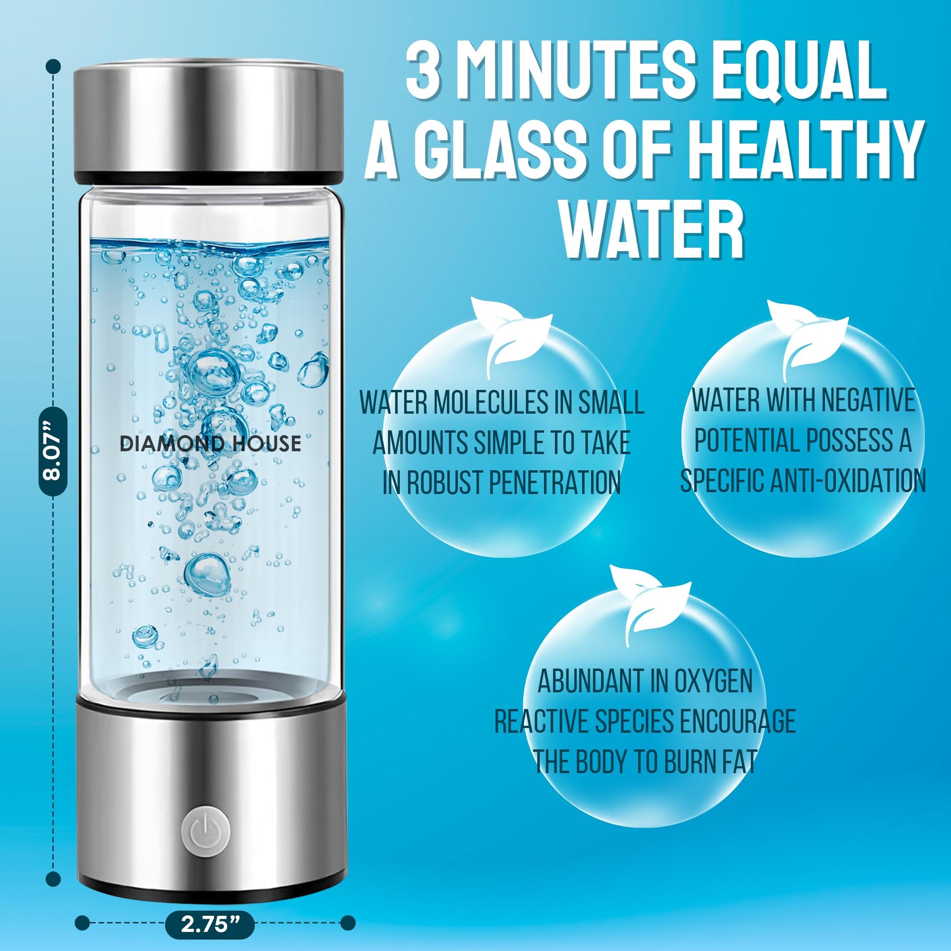 - HIGH QUALITY & HYGENIC: The Diamond House Hydrogen Water Bottle is constructed of high-quality glass, sanitary, crack-resistant, easy to clean, and odorless. Hydrogen-enriched water can improve mood, improve sleep quality, increase metabolism, and purify your blood.