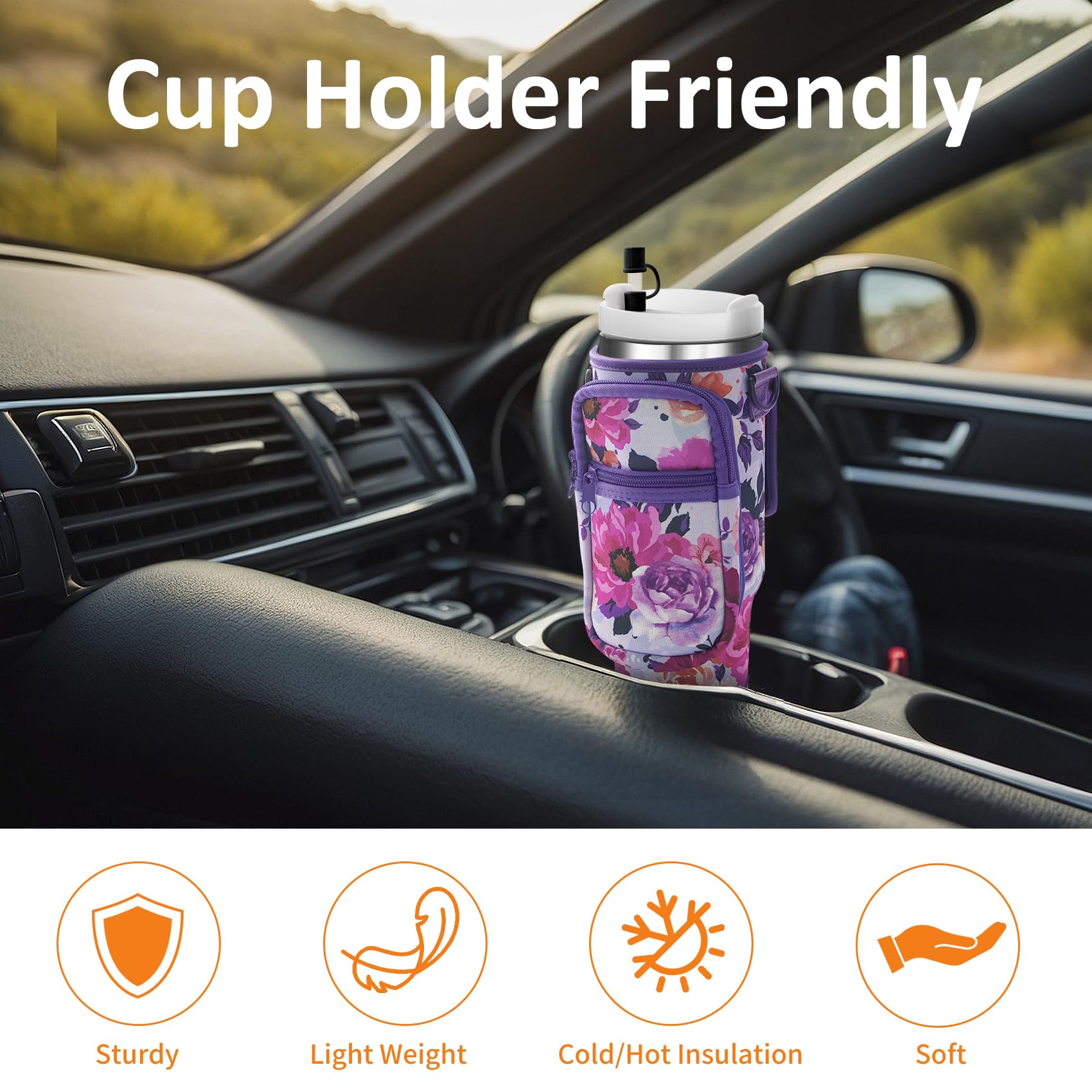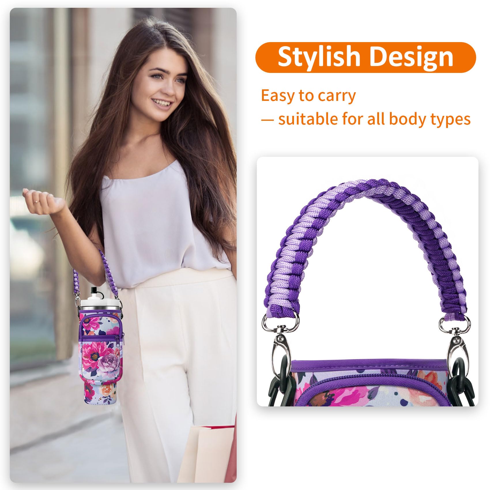 AceTreker Water Bottle Sling Bag with Paracord Handle for Stanley 30/40 oz Tumbler Insulated Thermos Car Mug Carrier Pouch with Phone Pocket & Straw Cap for Stanley Cup Accessories-Purple Rose