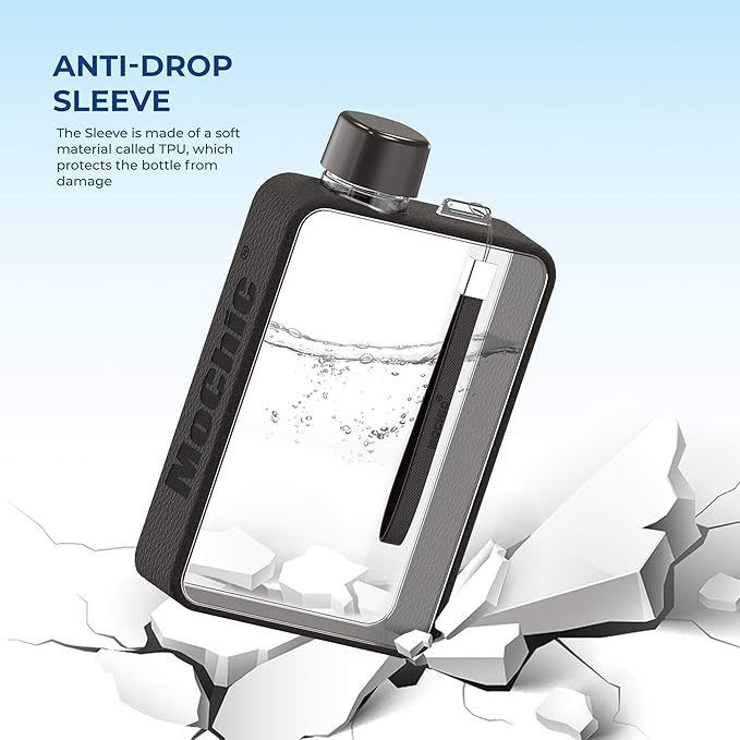 - 5- Versatile for Your Daily Needs: Not just your average clear flask, but a multitasking flat water bottle for travels and beyond, our A5 water bottle has no limits; Ideal as a camping water bottle, compact water bottle for backpack side pocket, bag water bottle for school trips, or a pretty water bottle for gym - endlessly practical, our Black clear water bottle has it all
