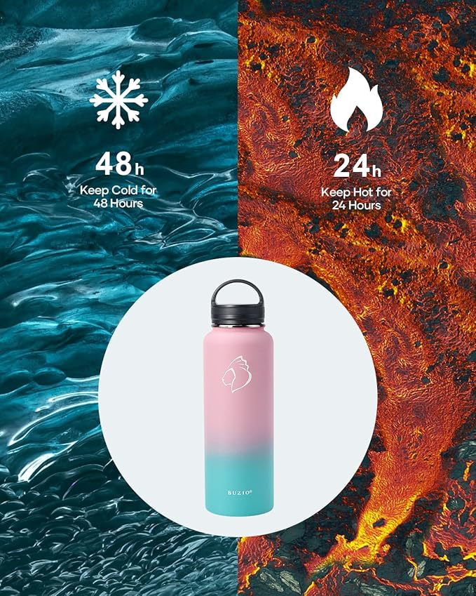 - Super Deal Combo: Buy 40oz insulated water bottle, get 7 accessories, a worry-free lifetime warranty, and friendly customer service. BUZIO water bottle with a delicate packaging box works as a perfect gift for your loved ones.