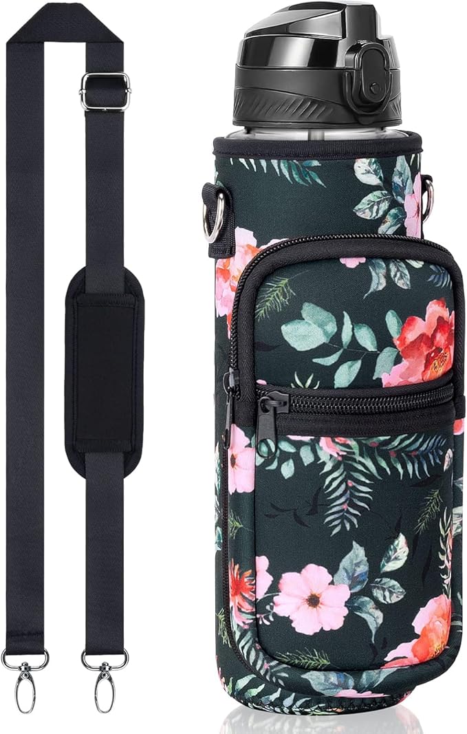 - PORTABLE STORAGE SLEEVE: 32oz water bottle is designed with high quality 5mm Neoprene sleeve, which not only can protect the water jug from slight bumps & scratch, but also keep water cold 2-3 hours(water bottle is not insulated) and avoid condensation. Water bottle sleeve with 2 zipper pockets are designed for carrying your phone, cards, airpods, keys, purse etc. Water bottle carrier with shoulder strap, which can be adjusted from 25' to 50', offers, women, men more carrying options.