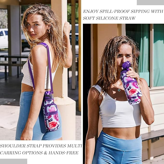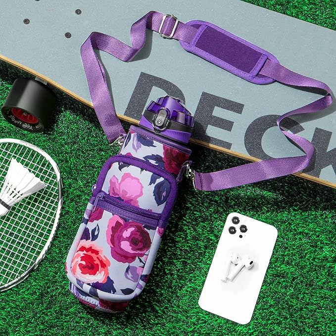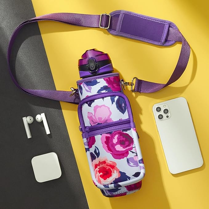 - PORTABLE STORAGE SLEEVE: 32oz water bottle is designed with high quality 5mm Neoprene sleeve, which not only can protect the water jug from slight bumps and scratch, but also keep water cold 2-3 hours(water bottle is not insulated) and avoid condensation. 2 zipper pockets are designed for carrying your phone, cards, airpods, keys etc. Comes with an adjustable & removable padded shoulder strap, which can be adjusted from 25' to 50', offers, women, men more carrying options and hands free.