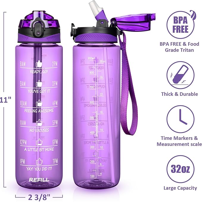 - MOTIVATIONAL & MEASURABLE SCALE DESIGN: Designed with time marker and inspirational quotes, the Fimibuke water bottle allows you to easily grasp the daily water consumption and helps you to drink enough water throughout the day. With storage sleeve accessories, 32 oz water bottle provides you with three ways to carry it that helps you to stay hydrated at any time. It is perfect for men and women in work, travel, running, cycling, camping, football or other exercises.