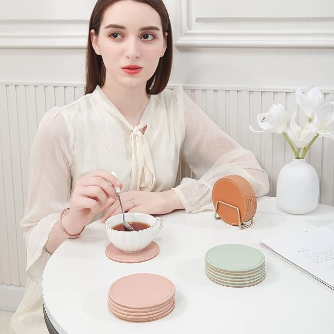 - Decorative Coasters: Modern and elegant design, this drink coaster can matched with any kind of home decor. PU leather drink coaster smooth surface which is gentle to your end tables or coffee table and will not leave any scratches. The neat and fine stitches make the coaster more durable for use while it adds an elegant look to the coaster.