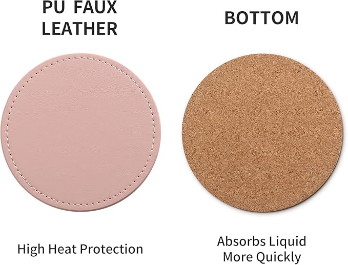 - Ideal Size&Material: Coaster diameter 3.9 inches, suitable for holding coffee cups, plastic cup, goblet and mugs. Made of high quality faux PU leather, durable, water resistant and easy to clean. Cork base can absorb water quickly besides protect your desktops from hot drinks, always keep your desktops dry and clean.