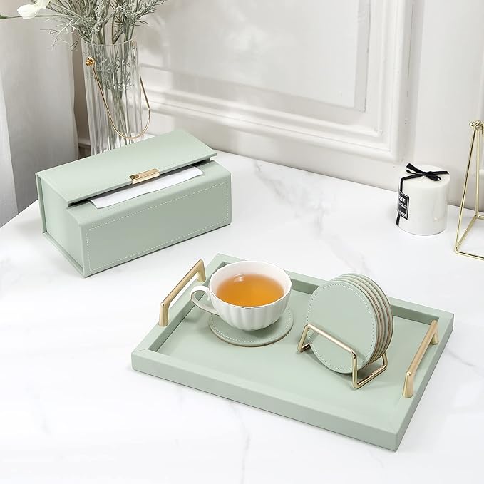 - Metal Coaster Holder Include: Coasters set includes 6 pieces coasters and a gold metal coaster holder, neatly stack coasters in the holder when not in use, makes coasters look better organized, also make your desktop tidier and save space.