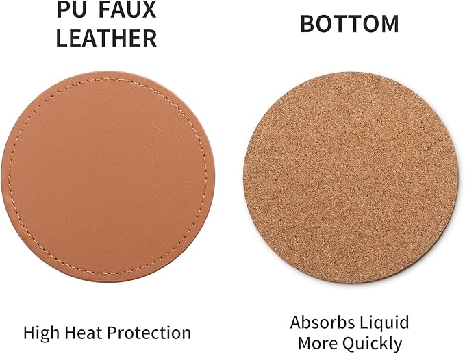- Ideal Size&Material: Coaster diameter 3.9 inches, suitable for holding coffee cups, plastic cup, goblet and mugs. Made of high quality faux PU leather, durable, water resistant and easy to clean. Cork base can absorb water quickly besides protect your desktops from hot drinks, always keep your desktops dry and clean.