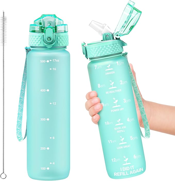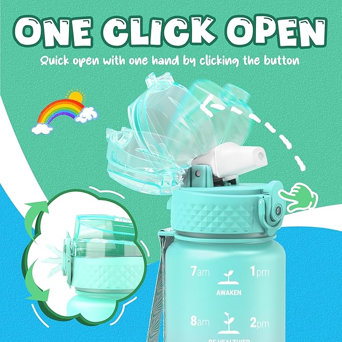 Oldley Kids Water Bottle for School, 17 oz (Straw Lid) BPA-Free Reusable Leak-proof Durable Tritan Plastic Water Bottles with One-handed Opening Straw Lids, Anti-dust Spout Cover (Mint Green)