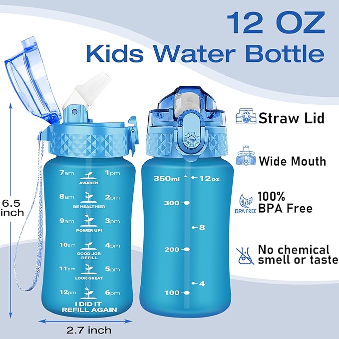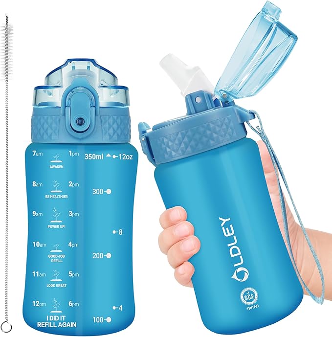 OLDLEY Kids Water Bottle for School, 12 oz (Straw Lid) BPA-Free Reusable Leak-proof Durable Tritan Plastic Water Bottles with One-handed Opening Straw Lids, Anti-dust Spout Cover (Blue)