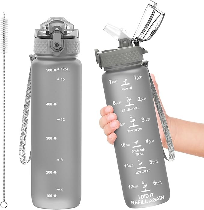 OLDLEY Kids Water Bottle for School, 17 oz (Straw Lid) BPA-Free Reusable Leak-proof Durable Tritan Plastic Water Bottles with One-handed Opening Straw Lids, Anti-dust Spout Cover (Grey)