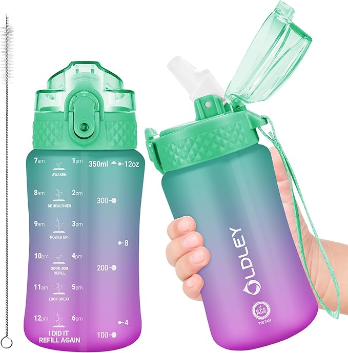 OLDLEY Kids Water Bottle for School, 12 oz (Straw Lid) BPA-Free Reusable Leak-proof Durable Tritan Plastic Water Bottles with One-handed Opening Straw Lids, Anti-dust Spout Cover (Green-Purple)