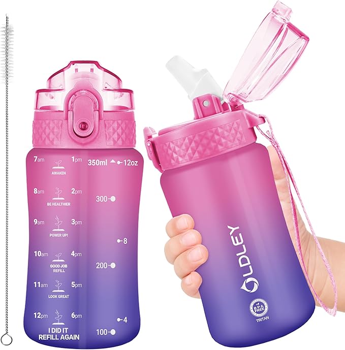 OLDLEY Kids Water Bottle for School, 12 oz (Straw Lid) BPA-Free Reusable Leak-proof Durable Tritan Plastic Water Bottles with One-handed Opening Straw Lids, Anti-dust Spout Cover (Rosepurple)