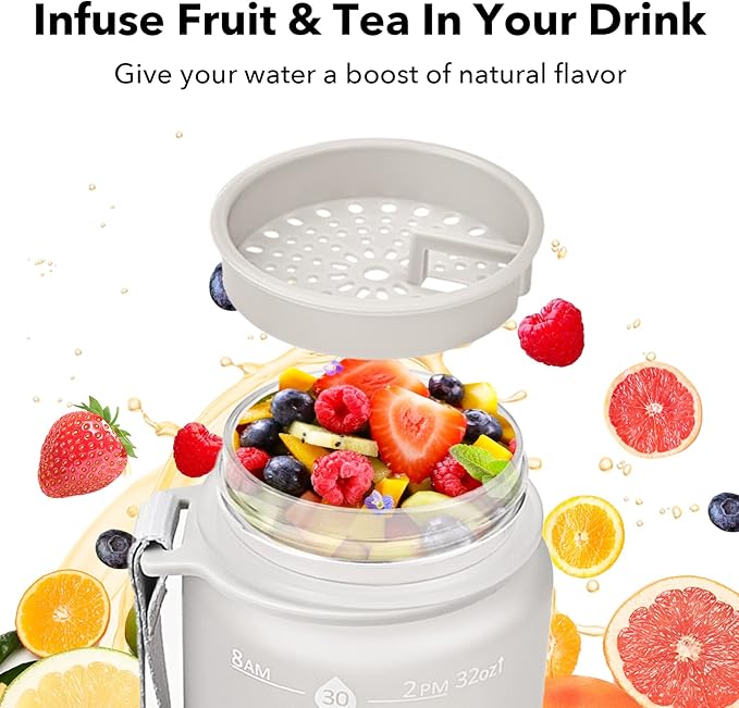 GOSWAG 32oz Motivational Water Bottles with Time Marker and Fruit Strainer, Sports Water Bottle with Times to Drink, Leakproof, Reusable Plastic Bottle with Strap no Straw for Gym, School