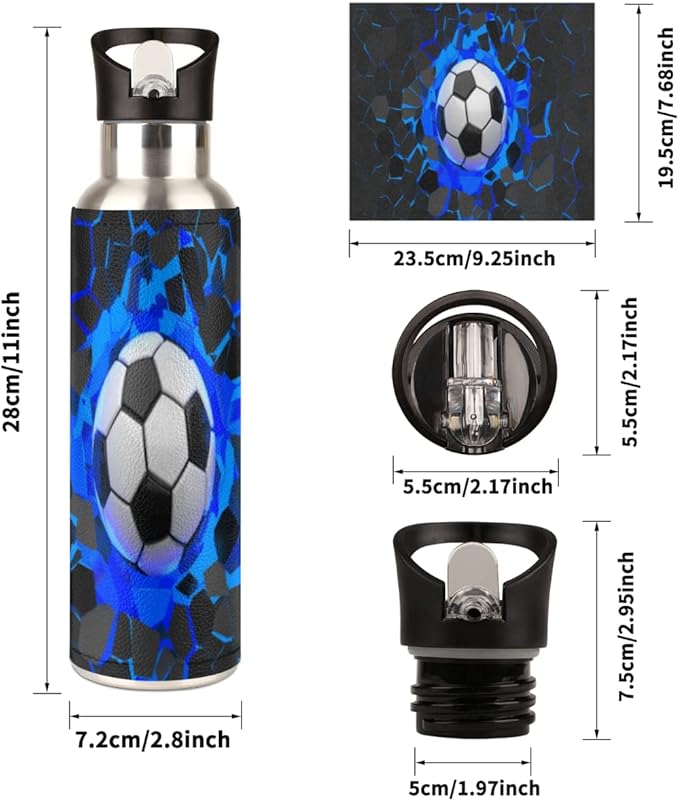 Insulated Stainless Steel Water Bottle with Straw 20oz Blue Black 3d Sport Soccer Football Sports Water Bottles BPA Free Leakproof Metal Vacuum Flask Jug for Kids Gym Fitness