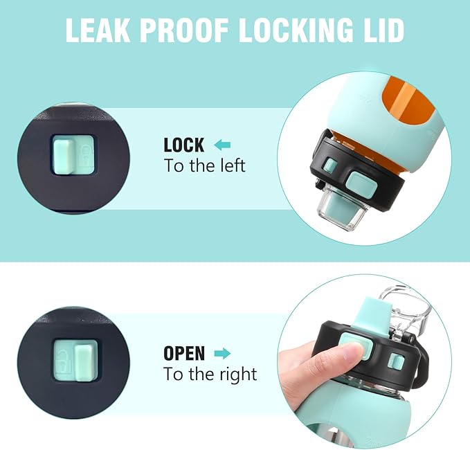- LOCKING LID & CARRY LOOP - The locking lid ensures no spills while on the go and prevents accidental leakage even the water bottle tip over or be laid on its side. The lid flips open at the push of a button. The carry loop is made from a durable and flexible material that can withstand the weight of the filled bottle and the stress of carrying. Leak-proof lid, soft silicone straw mouth piece and travel friendly soft grip hand.