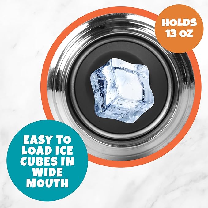 - HOLDS 13 OZ: This waterbottle holds 13 ounces of liquid, with a mouth wide enough for most ice cubes. Measuring about 8 in x 3 in, it fits on the side of most backpack pockets, making it great for Back to School, Day Care, Sports Practice, Summer Camp and more!
