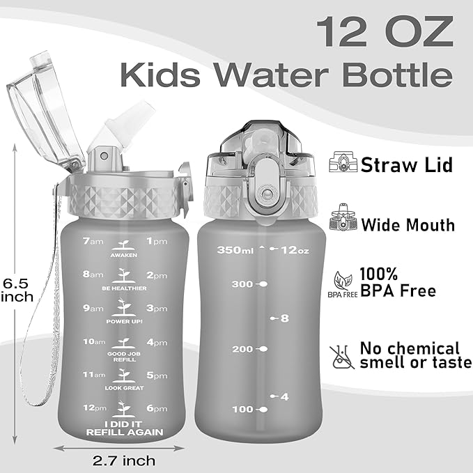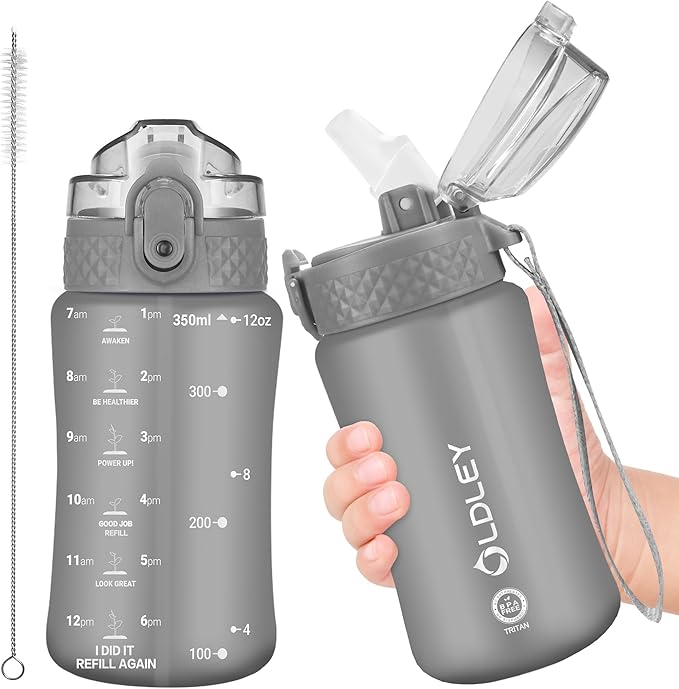 OLDLEY Kids Water Bottle for School, 12 oz (Straw Lid) BPA-Free Reusable Leak-proof Durable Tritan Plastic Water Bottles with One-handed Opening Straw Lids, Anti-dust Spout Cover (Grey)