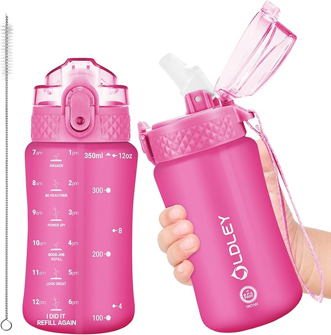 OLDLEY Kids Water Bottle for School, 12 oz (Straw Lid) BPA-Free Reusable Leak-proof Durable Tritan Plastic Water Bottles with One-handed Opening Straw Lids, Anti-dust Spout Cover (Rose red)
