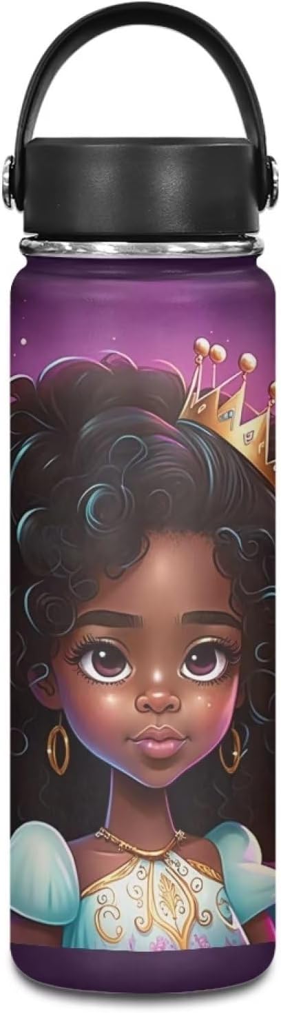 African Insulated Water Bottle 18 oz Stainless Steel Vacuum Flask with Handle Thermal Bottles Keeps Drinks Hot or Cold for Hours Lightweight Water Cup Black Queen American