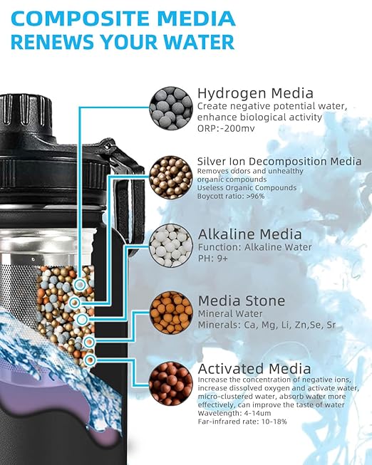 - Quick access to alkaline water: The filter water bottle design ensures that every drop of water is fully passed through the filter, bringing the pH of any water to 9.5+ in just a few minutes. You can enjoy alkaline water with minimal waiting time. It also enriched the water with hydrogen.