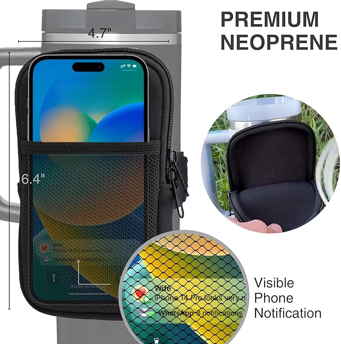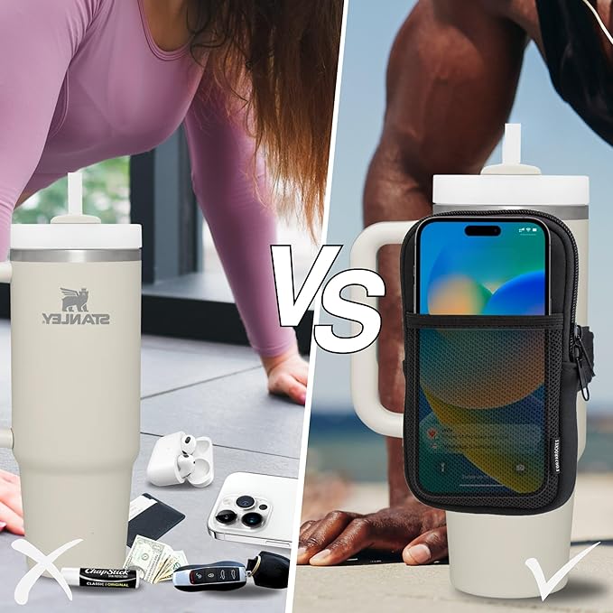 - DUMP THE BULKY PURSE & BAG β Free your hand & enjoy your activities only with the upgraded Stanley cup bag pouch, whether itβs the gym or a walk. The mesh cell phone pouch & large pocket with zipper is perfect for most phones and small belongings. Tumbler pouch with pocket holds keys cards, lipsticks, chapsticks, earphones, IDs. Stay organized with compact Stanley backpack for cup.