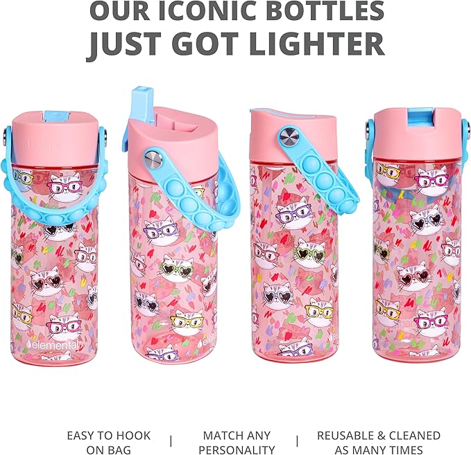 Elemental Leak Proof Water Bottles for Kids - Splash Kids Water Bottle for School with Fun Fidget Pop-it Handle - BPA Free Tritan Plastic Reusable Water Bottle with Straw - Stylish Cat - 18oz