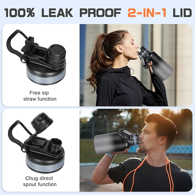 - Dual Use 2-in-1 Lid - 100% Leak-proof half gallon insulated water jug lid features a straw and chug lid function. With this spill-proof two-in-one lid, you can sip freely when you are busy or on the go.
