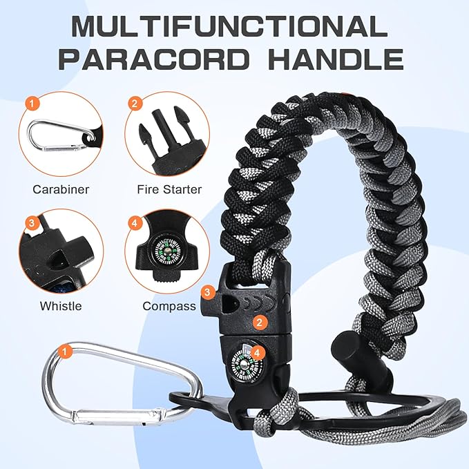 - Full-function Paracord - With brilliant matching colors brings a touch of youthful vibe to the jugs. As a sturdy survival handle it comes with a carabiner, compass, fire starter and whistle, perfect for your wild adventures.