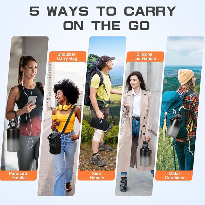 Insulated Water Bottle 64 oz, Half Gallon Water Jug Cold 48H, BPA Free Stainless Steel Bottles with Straw/Chug 2-in-1 Lid, Bag, Paracord Handle, Silicone Boot, Sports Gym School Metal Flask