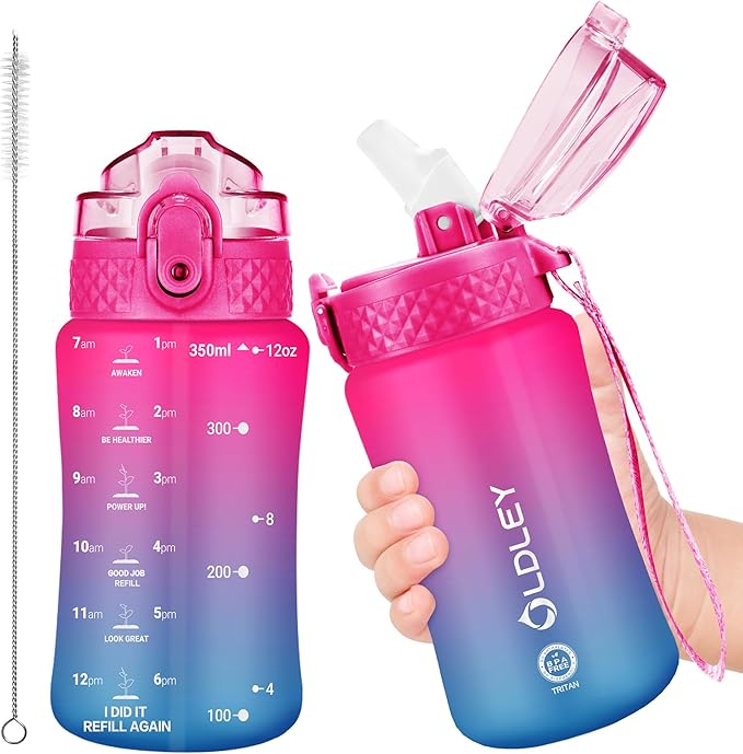 OLDLEY Kids Water Bottle for School, 12 oz (Straw Lid) BPA-Free Reusable Leak-proof Durable Tritan Plastic Water Bottles with One-handed Opening Straw Lids (Rose Ocean Blue)