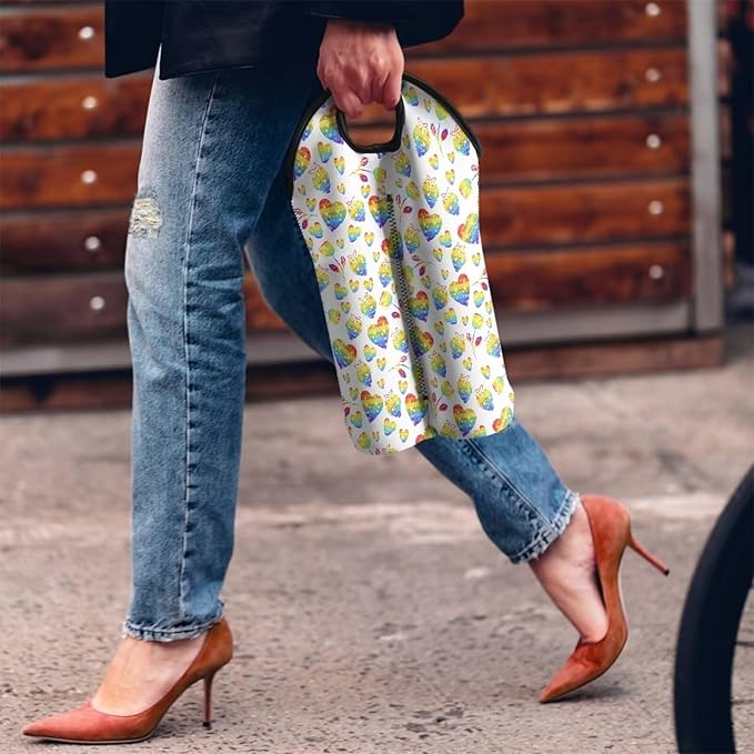 doginthehole 2 Bottle Wine Carrier Gift Bag Colorful Heart Print Neoprene Wine Tote Portable Champagne/Water Bottle/Beer/Drinks Carrying Bag for Travel, Picnic, Party