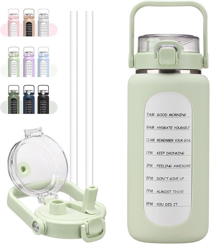 BLUEGO 64oz Insulated Water Bottle with Straw and Handle Leakproof Half Gallon Wide Mouth Motivational Water Bottle, 2-IN-1 Straw Spout Lid Stainless Steel Water Jug for Sport Travel Gym-Light Green