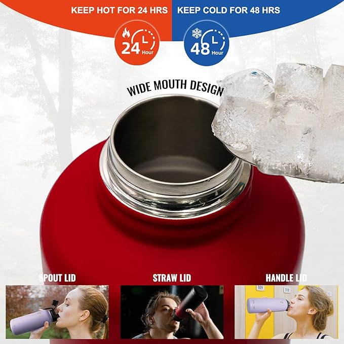 - 【DOUBLE-WALL VACUUM INSULATION】- We insulated water bottles adopt double-layer insulation wall design and vacuum sealing. This means you can enjoy your favorite hot and cold drinks for a long time, no matter what weather you're in. It can keep hot drinks hot for 24 hours and cold drinks cold for 48 hours! Advanced technology prevents heat transfer to outer wall, protects your hands from the temperature of beverage.