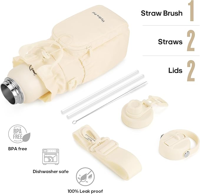 - COMPLETE ACCESSORY KIT: Includes a high-quality insulated water bottle, a waterproof holder with strap, straw lid, spout lid, two straws, & a straw brush