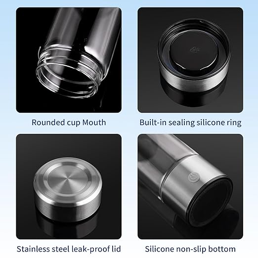 - 💖💖【Food Grade Material】Made of food-grade borosilicate glass, it is sturdy and durable and does not contain any harmful substances. The lid of portable hydrogen water generator has a closed design and a thick sealing ring, which provides strong sealing and maintains the concentration of hydrogen. Don't let leaks become your worry. (❗❗ Please note that the hydrogen water cup should be placed upright when using it. If it is placed sideways or upside down, the water cup will leak due to pressure.)