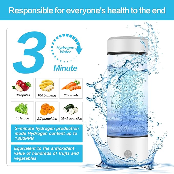 - 【The Perfect Health Gift】Our hydrogen-rich water bottle, equipped with a one-button start/stop function and slip-resistant EVE pads, is easy to use in various settings. Ideal for the office, work, or workouts, it makes a perfect health gift for family and friends on occasions like Birthday, Thanksgiving, Christmas, New Year, and Anniversaries. Enriched with antioxidan