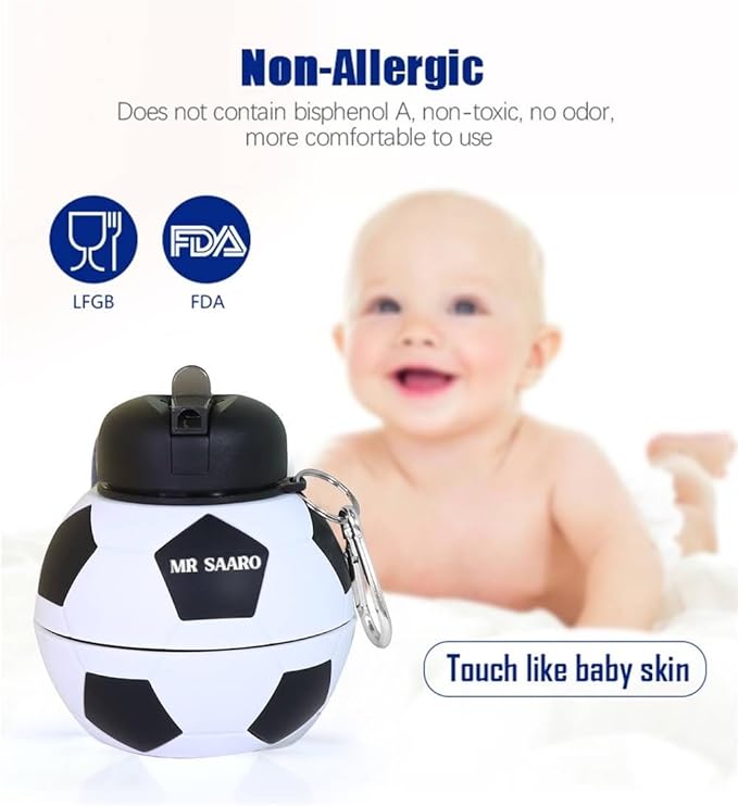 - Food Grade Silicone > Our Soccer-shaped kids water bottle consists of BPA - free silicone that has no harsh chemicals.