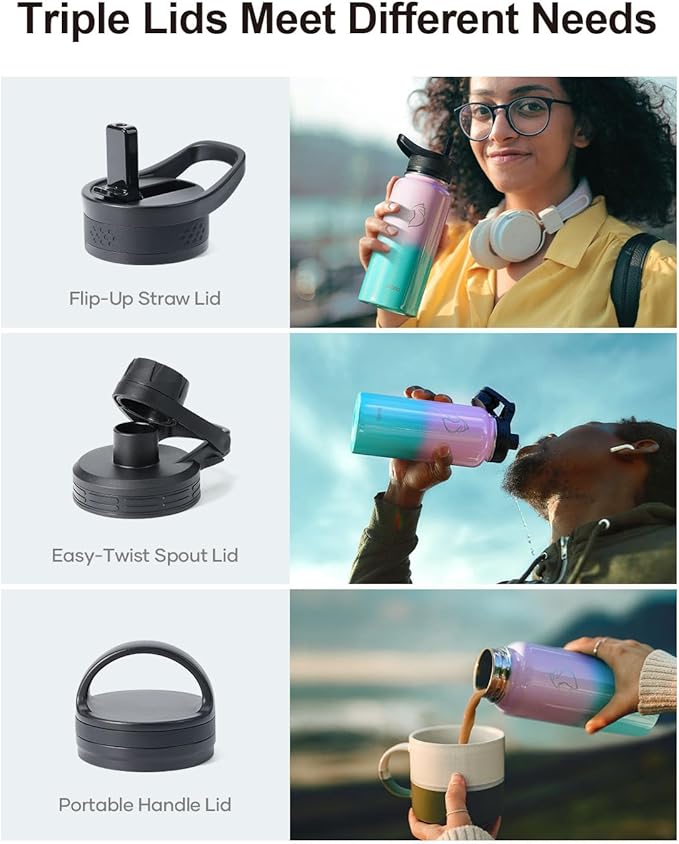 - 3 Caps Pack, 100% Leak-Proof: BUZIO stainless steel water bottle comes with 3 lids: portable handle lid, easy-twist spout lid, and flip-up straw lid to meet camping, hiking, cycling, fitness sports and more. Each lid has a thickened 360° seal for 100% leak-proof.