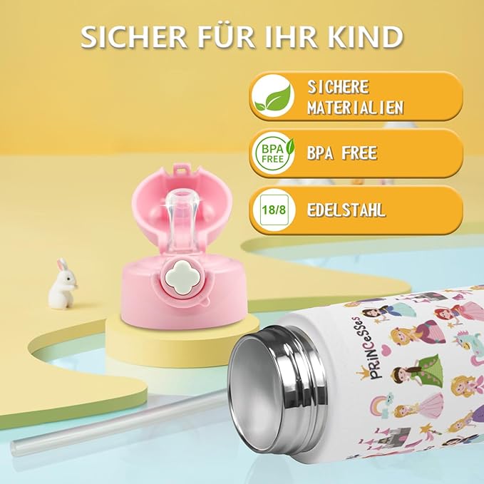 Kids Insulated Water Bottle with Covered Pop-Up Straw,16oz Kids Cups with Stainless Steel Leak Proof for School Boys Girls(2-Princess)