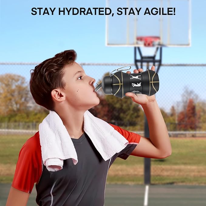 Kids Sports Collapsible Water Bottle | Ball Shaped Drinking Cup | Foldable BPA Free Leakproof Lightweight Silicon Jug | School Lunch Mug Team Gift Travel (Basketball Black 550ml/18.6oz)