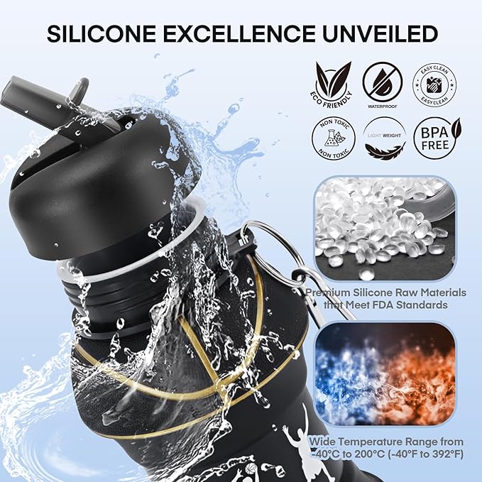 - COLLAPSIBLE CONVENIENCE: Say goodbye to bulky bottles taking up precious space in backpacks! Our collapsible design allows the bottle to shrink down to a fraction of its size when empty, making it easy to stash away when not in use.