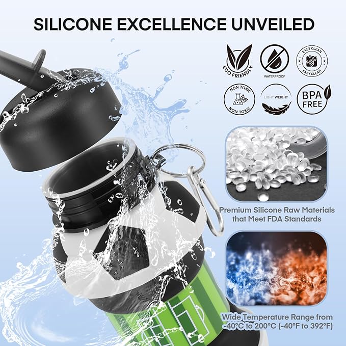 Kids Sports Collapsible Water Bottle | Ball Shaped Drinking Cup | Foldable BPA Free Leakproof Lightweight Silicon Jug | School Lunch Mug Team Gift Travel (Soccer 550ml/18.6oz)