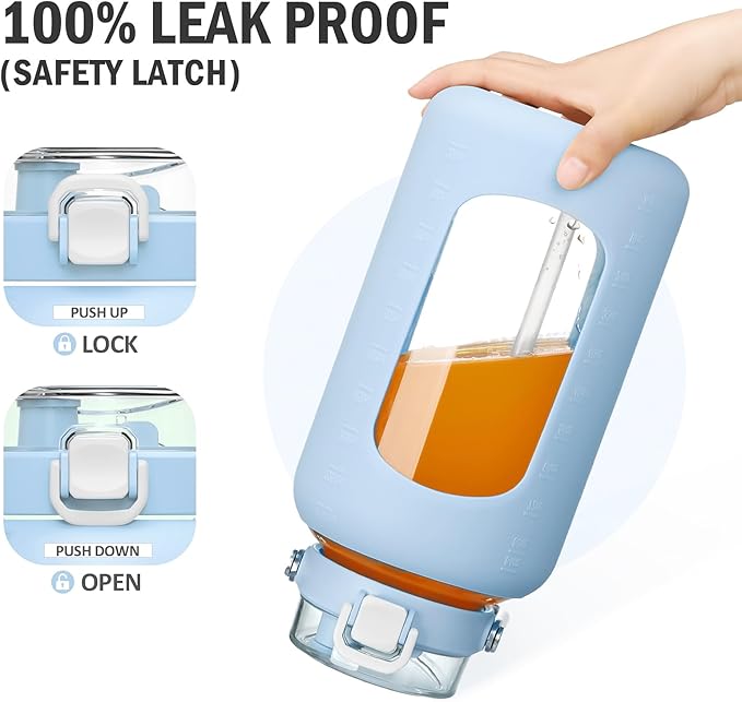 - INNOVATIVE DUAL-PURPOSE LID -The straw lid of 84oz glass water bottle offers two ways to drink. Whether you prefer sipping through a Flip Straw or chug from the Spout Mouth, the unique 2-In-1 Lid got you covered. The Leakproof lid also features a One-click Snap Lock and Dust-proof Cap for cleaner and more Hygienic drinking experience. One-handed operation-Push up to lock, Push down to unlock.