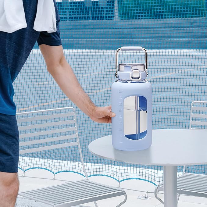 84oz Glass Water Bottle with Stainless Steel Handle,2.5L Gallon Water Bottle With 2-IN-1 Straw Lid, Silicone Sleeve and Motivational Capacity Marker, Wide Mouth Water Jug For Gym, Workout, Blue