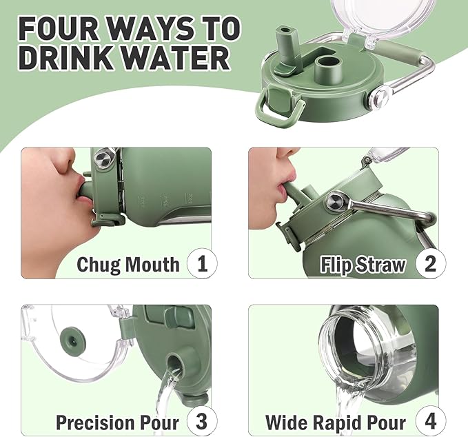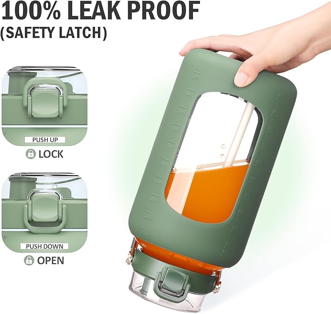 - INNOVATIVE DUAL-PURPOSE LID -The straw lid of 84oz glass water bottle offers two ways to drink. Whether you prefer sipping through a Flip Straw or chug from the Spout Mouth, the unique 2-In-1 Lid got you covered. The Leakproof lid also features a One-click Snap Lock and Dust-proof Cap for cleaner and more Hygienic drinking experience. One-handed operation-Push up to lock, Push down to unlock.