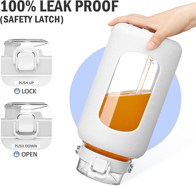 - INNOVATIVE DUAL-PURPOSE LID -The straw lid of 84oz glass water bottle offers two ways to drink. Whether you prefer sipping through a Flip Straw or chug from the Spout Mouth, the unique 2-In-1 Lid got you covered. The Leakproof lid also features a One-click Snap Lock and Dust-proof Cap for cleaner and more Hygienic drinking experience. One-handed operation-Push up to lock, Push down to unlock.