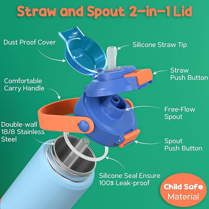 - 3-in-1 Lid & Kid-Friendly: Equipped with a dual-use & push-button lid for toddler cup, kids can sip through a silicone straw and enjoy a fast-flow chug by easily switch the two button, makes it easy for your child to use independently. Straw cup can prevent kids from choking or water pollution, direct chug cup help kids drinking quickly. If your kid is thirsty, just take off lid, drink freely from the wide mouth.The artful kids water bottle is an ideal choice for school and kid's outdoor sports!