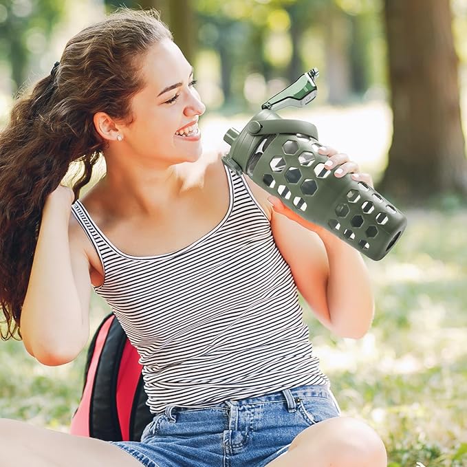 - SILICONE SLEEVES FOR BETTER GRIP:Use this water tumblers at home, office, take it to the gym or anywhere really! Our glass water bottles comes with a stylish silicone sleeve to offer you additional protection and to provide an extra grip to the bottle. The sleeve is removable, so you can use the water jug with or without it.