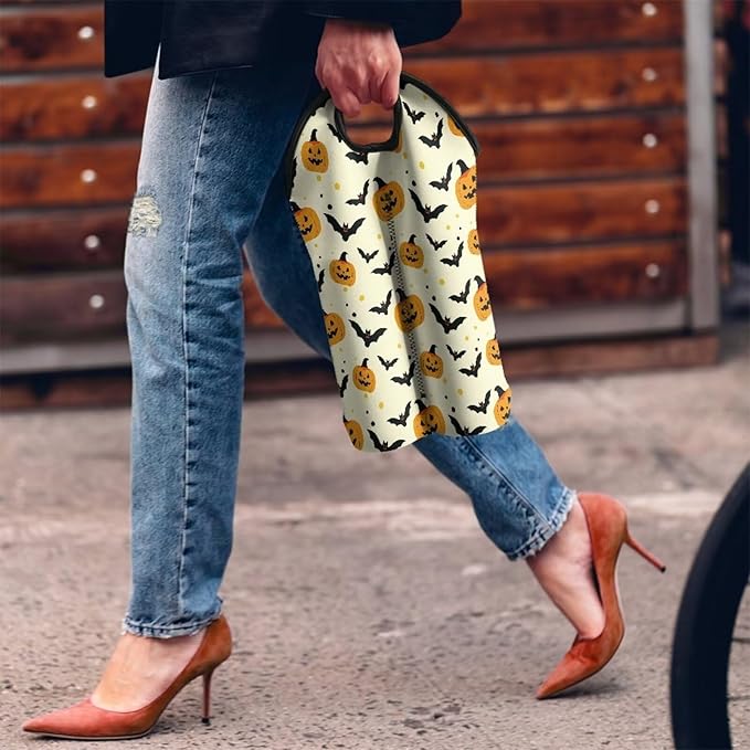 doginthehole 2 Bottle Wine Carrier Tote Halloween Pumpkin Bats Print Wine Bottle Protector Bag Portable Neoprene Wine/Beer/Champagne/Water Bottle Holder for Travel with Handle