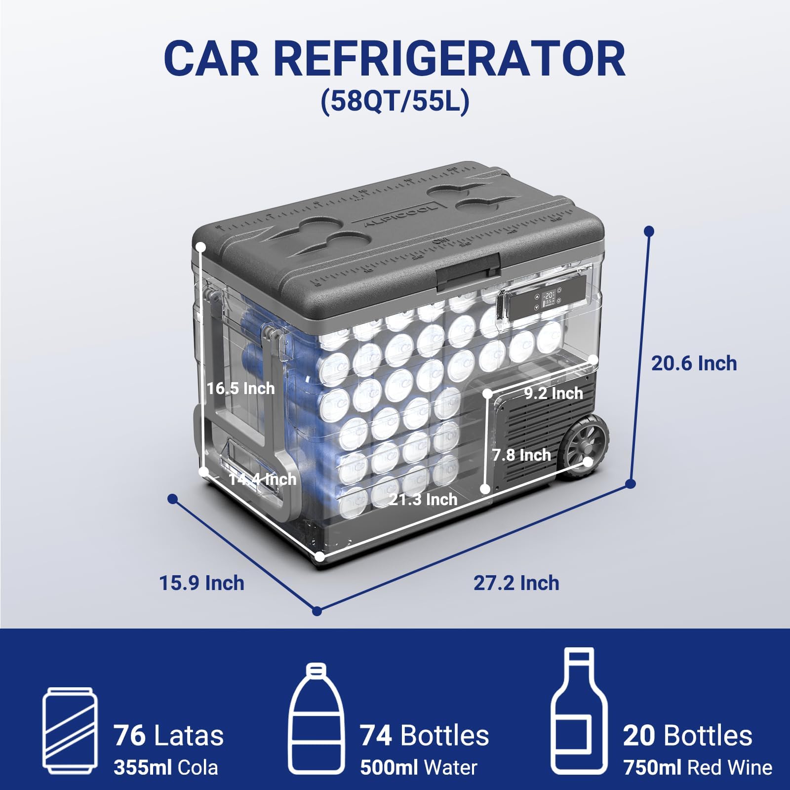 BODEGACOOLER 12 Volt Car Refrigerator,58QT(55L) Car Fridge with Wheels,RV Portable Freezer Single Zone,with APP Control,-4℉-68℉ Car Cooler,12/24V DC & 100-240V AC,for Travel,Camping,Outdoor,Vehicles
